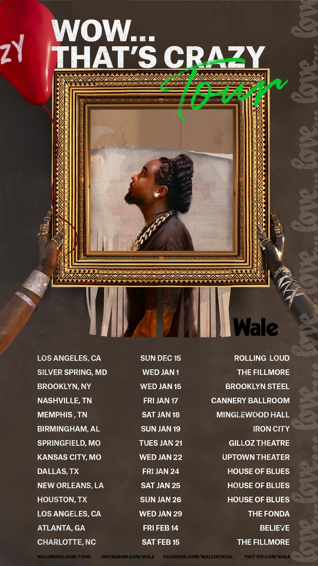 November 18, 2019 JUKEBOXDC Staff Events Wale Announces ‘Wow… That’s Crazy Tour’ Beginning in L.A. December 15th but really kicking off during Wale’s annual New Year’s Day concert in Silver Spring. Dates are below. View this post on Instagram Back by popular demand… we’ve decided to get back on the road and come play my new album. #WowThatsCrazyTour 2020 on sale now. Link in bio. A post shared by Wale (@wale) on Nov 15, 2019 at 11:02am PST Share this: Click to share on X (Opens in new window) X Click to share on Facebook (Opens in new window) Facebook More Click to print (Opens in new window) Print Click to email a link to a friend (Opens in new window) Email Click to share on Reddit (Opens in new window) Reddit Related WillThaRapper - "Homicide" (Video) Take A Daytrip Feat. Rico Nasty, slowthai & ICECOLDBISHOP - "Lighthouse" Leave a Reply Cancel replyYou must be logged in to post a comment. This site uses Akismet to reduce spam. Learn how your comment data is processed.